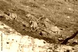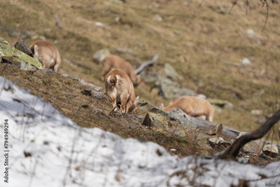 herd of steinbock capricorns grazing in Pontresina, Graubuenden, during summer. Ibex herd.