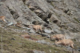 herd of steinbock capricorns grazing in Pontresina, Graubuenden, during summer. Ibex herd.