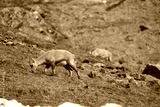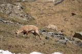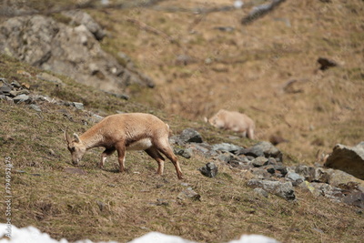 herd of steinbock capricorns grazing in Pontresina, Graubuenden, during summer. Ibex herd.