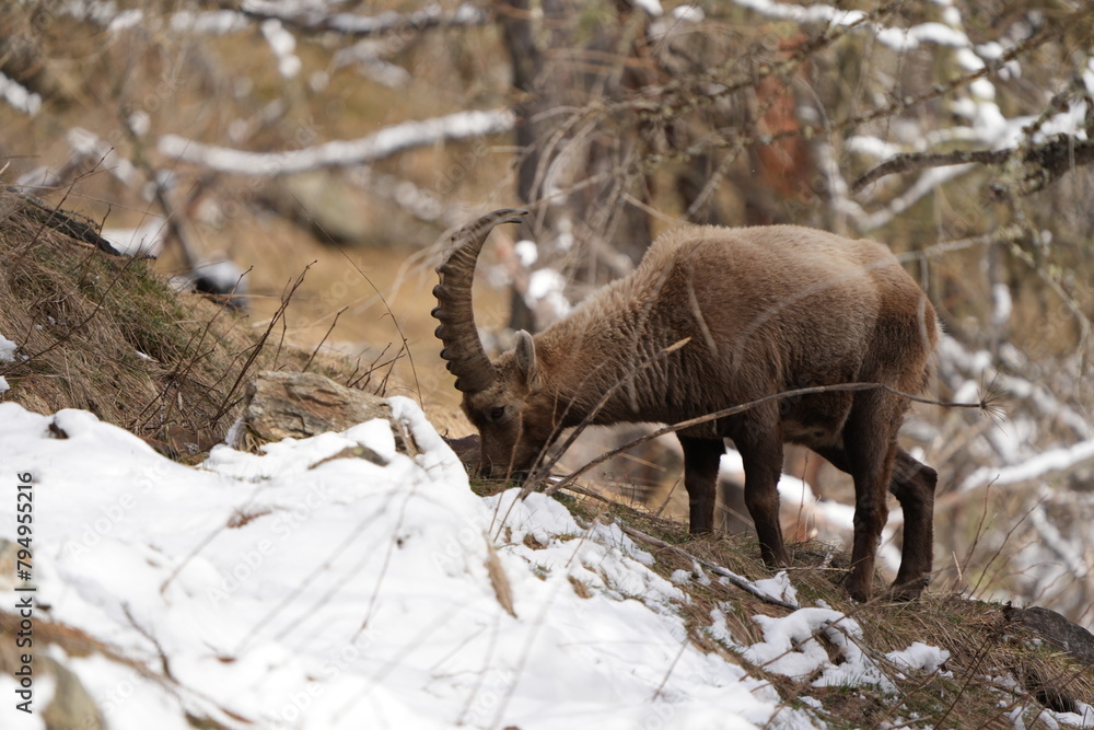 herd of steinbock capricorns grazing in Pontresina, Graubuenden, during summer. Ibex herd.