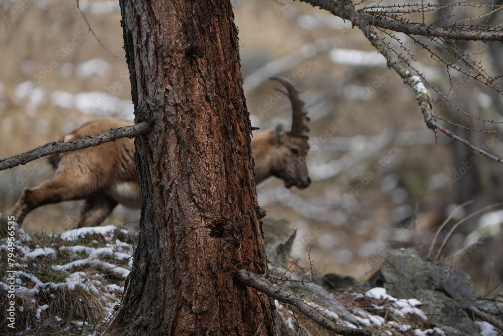 herd of steinbock capricorns grazing in Pontresina, Graubuenden, during summer. Ibex herd.