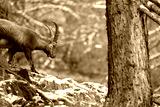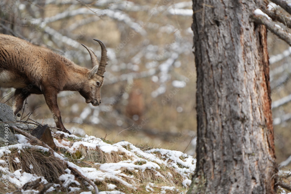 herd of steinbock capricorns grazing in Pontresina, Graubuenden, during summer. Ibex herd.