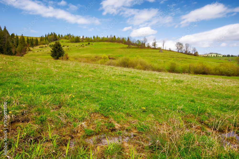 grassy meadow in spring. carpathian countryside with forested hills on a warn sunny day. beauty of trascarpathian rural landscape