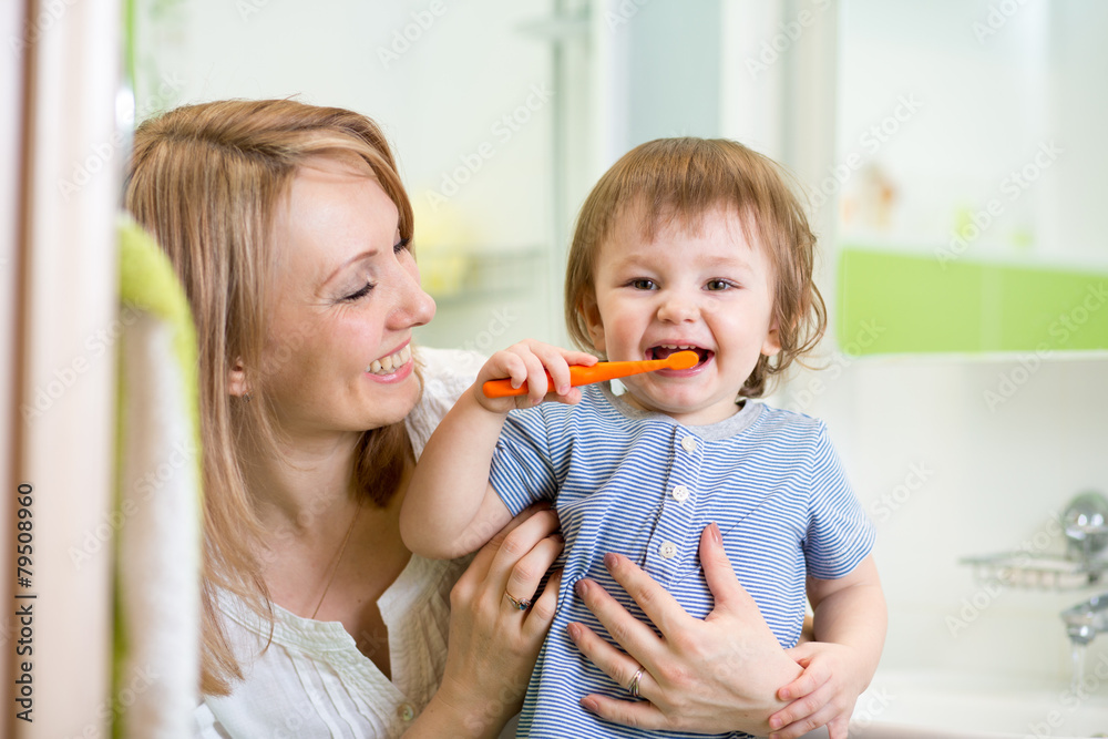 mother teaching child teeth brushing