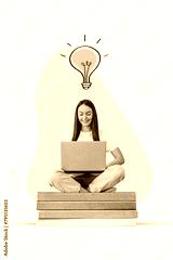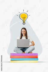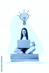 vertical collage of a girl sitting on a books with a laptop and a light bulb above her head