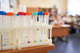 Vibrant lab test tubes in a rack, set against a blurred classroom backdrop. Perfect for educational and scientific themes.