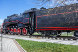 A steam locomotive with a steam power plant using steam engines as an engine. Mainline passenger steam locomotive. Ancient railway transport. Transportation of goods by rail.