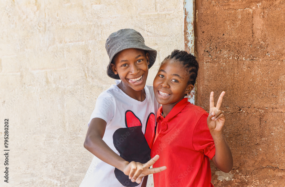 smiling african playful teenager girls outdoors in front of the house in a village