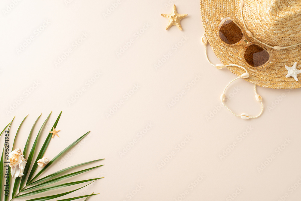 Soak up the sun: top view of straw hat, sunglasses, palm leaf, shells, and starfishes on a calm pastel beige backdrop