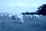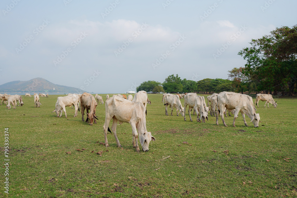 large herd of white cow in green grassy meadow under blue sky with white clouds.