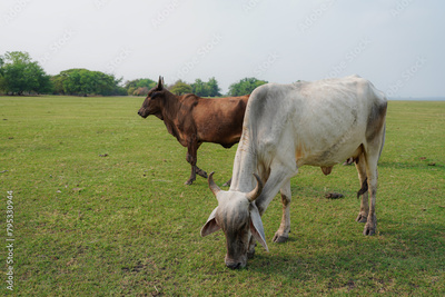 Black and white cows in a grassy field on a bright and sunny day. Cows grazing on a Field in Summertime.
