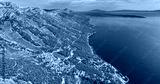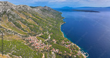 AERIAL: Charming coastal village in Adriatic with vineyards ascending hillside