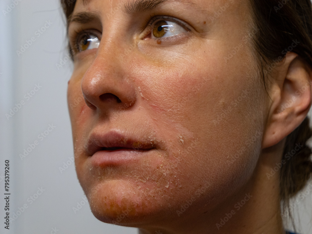 CLOSE UP, PORTRAIT: Young woman with severe sunburns on her face after sunbathing. Careless lady forgot to apply sunscreen before going out in the sun, which resulted in reddened and burnt facial skin