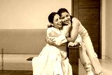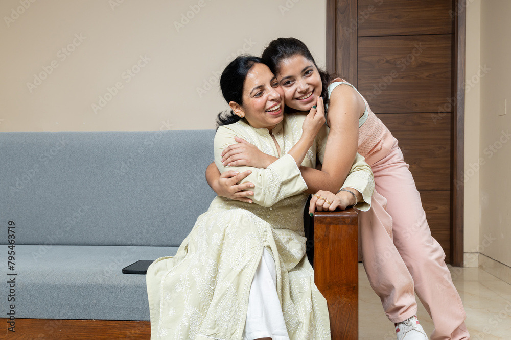 Indian Mother and Teen young daughter sitting on sofa at home looking towards the camera ,Happy Young teen hug Mother in living room having candid moments