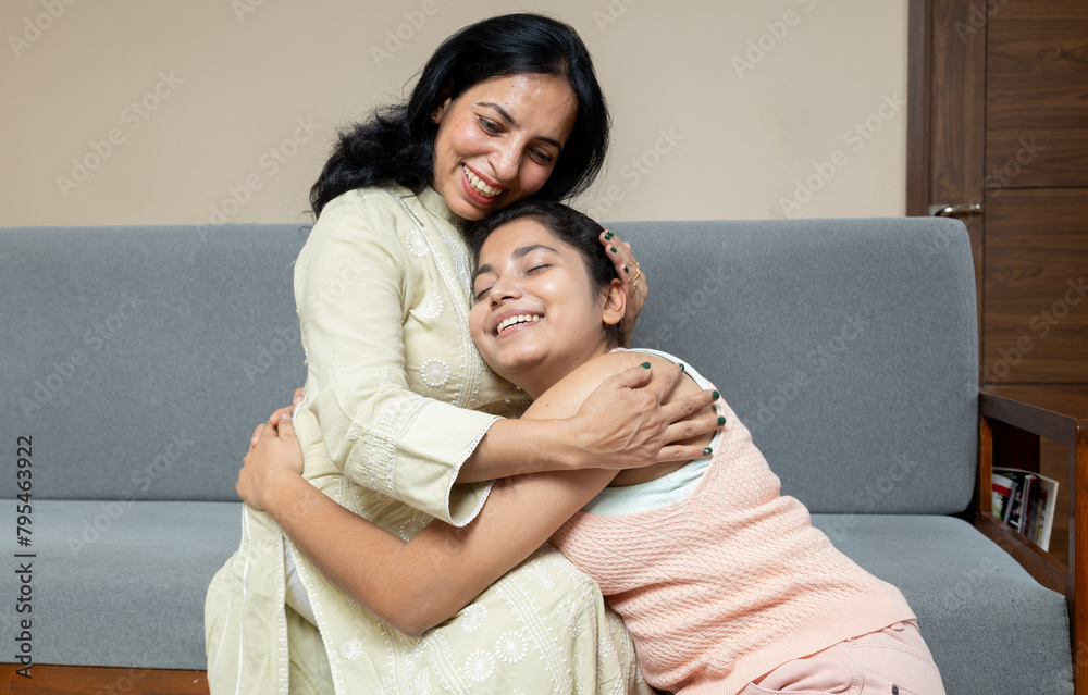 Mother hug Teenage daughter and Supporting her ,Indian Mother hug Teenage young girl sitting on sofa at living room,