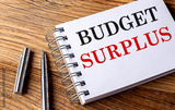 BUDGET SURPLUS text on notebook with pen on the wooden background