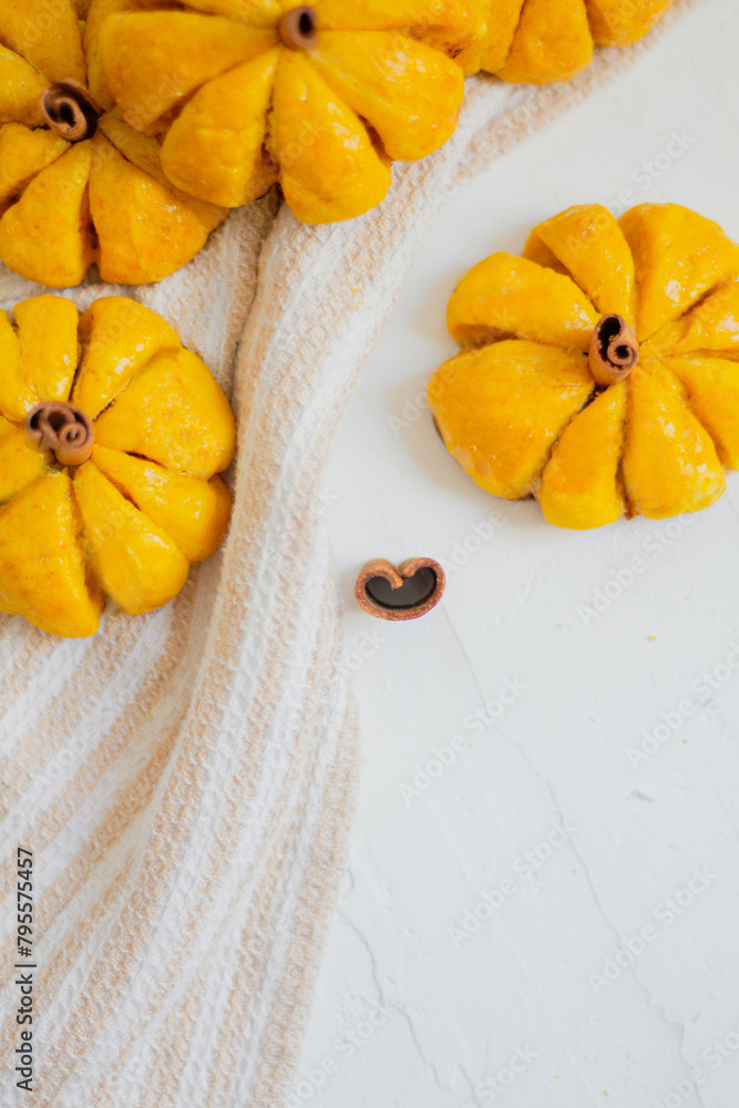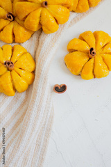 Pumpkin Shaped Bread. Autumn, Styled Composition with Neutral Colours.