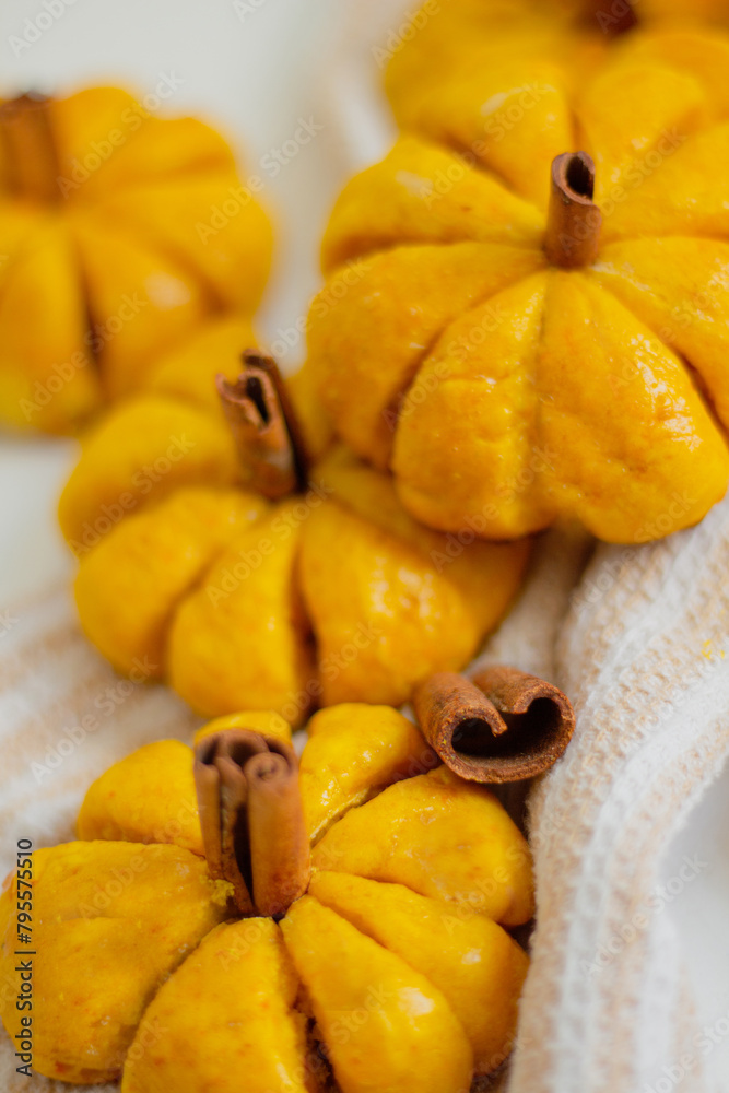 Pumpkin Shaped Bread. Autumn, Styled Composition with Neutral Colours.