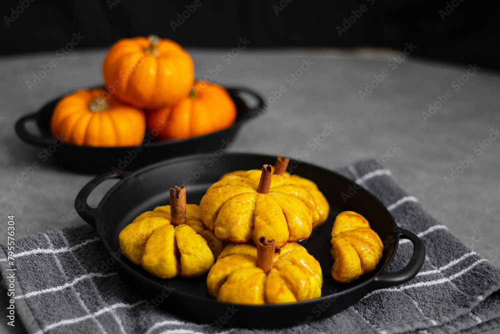 Pumpkin Shaped Bread. Autumn, Styled Composition with Neutral Colours.