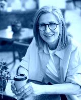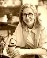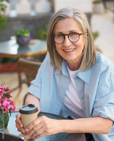 A woman is sitting at a table with a cup of coffee in front of her. She is smiling and she is enjoying her time