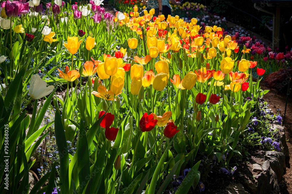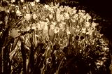 A grouping of bright yellow and red tulips with glowing side lighting.