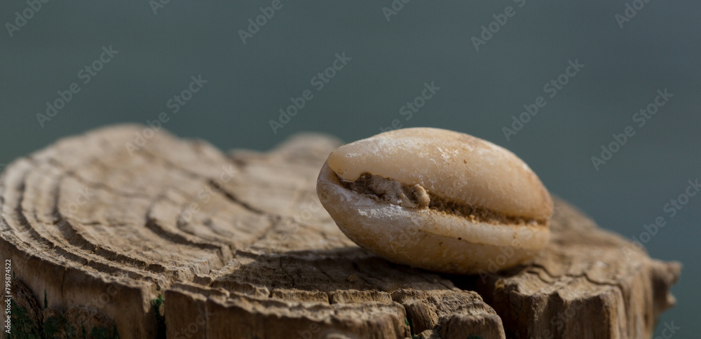 An extinct fossil shell of cypraea cowrie. Mauritia mauritiana, (humpback, chocolate, mourning cowry and Mauritius cowry), is a species of tropical sea snail, a cowry.
