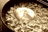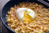 Instant noodles with poached egg in a bowl.