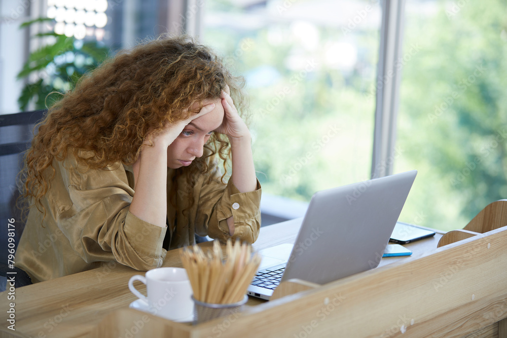 young woman working on laptop computer and feeling tired and having a headache from hard work in the office