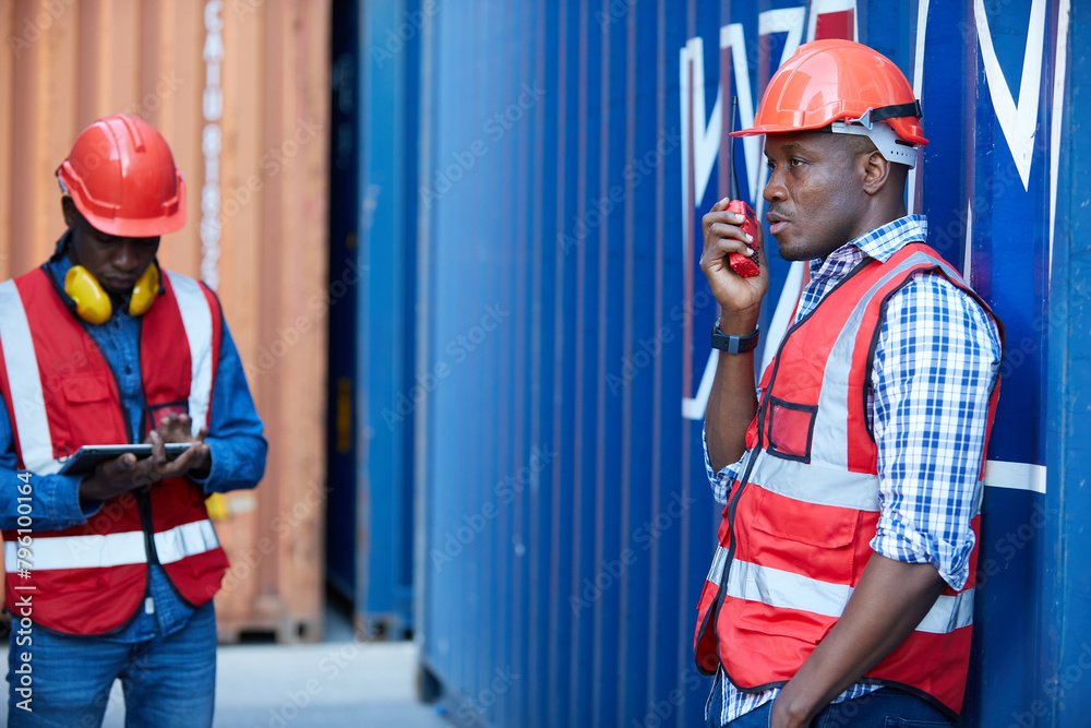 African factory worker or engineer using walkie talkie and talking about work in containers warehouse storage