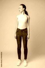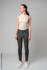 Girl in Beige Tank Top and Grey Jeans on gray background