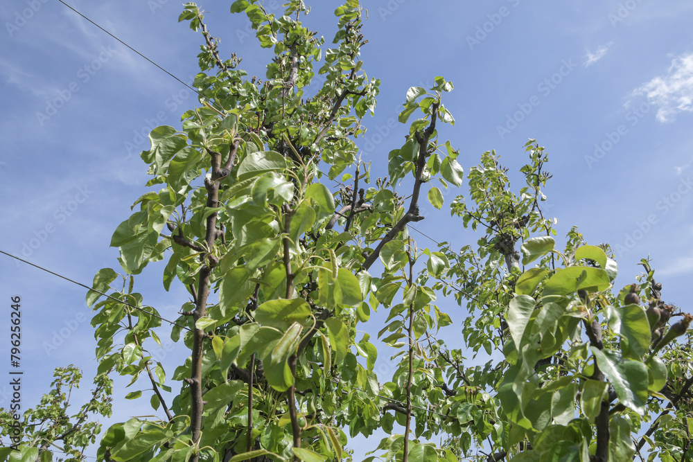 A fruit tree with green leaves and a blue sky in the background
