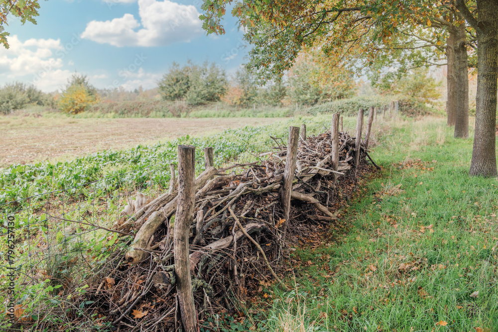 Autumn landscape with a wicker rustic fence made of dry branches close-up