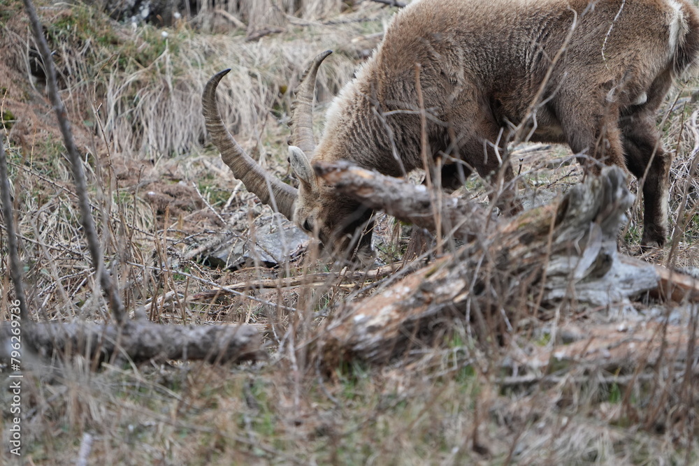 ibex, steinbock, mountain goat on a rock in pontresina graubuenden switzerland ch swis alps