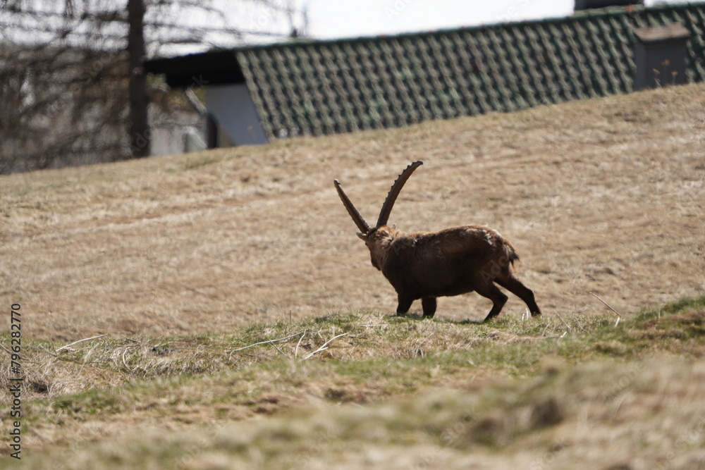 herd of steinbock capricorns grazing in Pontresina, Graubuenden, during summer. Ibex herd.