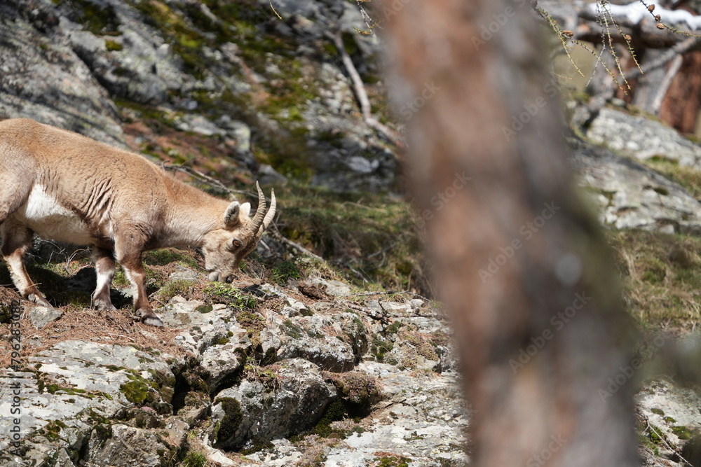 herd of steinbock capricorns grazing in Pontresina, Graubuenden, during summer. Ibex herd.