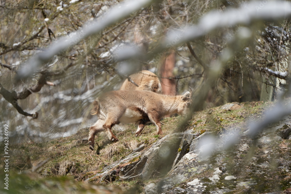 herd of steinbock capricorns grazing in Pontresina, Graubuenden, during summer. Ibex herd.