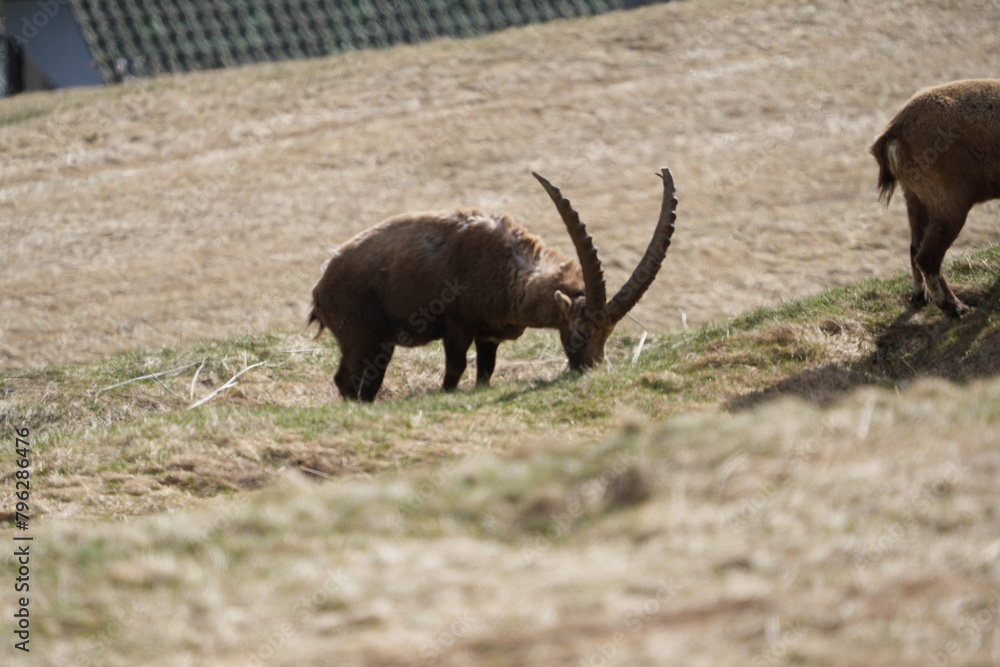 herd of steinbock capricorns grazing in Pontresina, Graubuenden, during summer. Ibex herd.