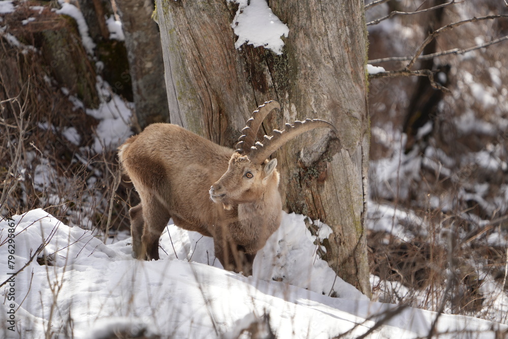 herd of steinbock capricorns grazing in Pontresina, Graubuenden, during summer. Ibex herd.