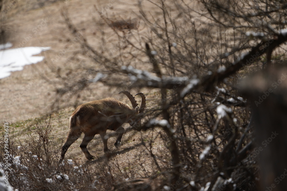 herd of steinbock capricorns grazing in Pontresina, Graubuenden, during summer. Ibex herd.