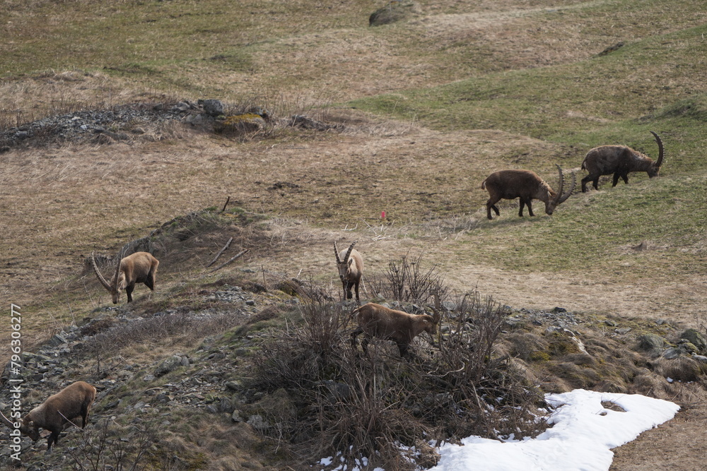 heard of Ibexes (Steinbock), Ibex, Carpricorn in Pontresina Graubuenden, part of a herd, snow, switzerland
