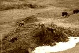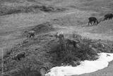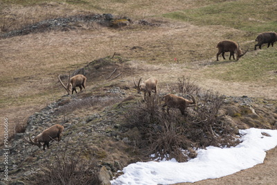 heard of Ibexes (Steinbock), Ibex, Carpricorn in Pontresina Graubuenden, part of a herd, snow, switzerland