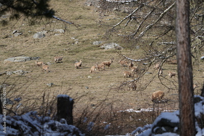 herd of steinbock capricorns grazing in Pontresina, Graubuenden, during summer. Ibex herd.