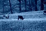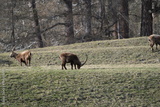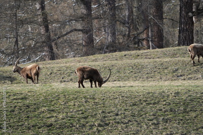 herd of steinbock capricorns grazing in Pontresina, Graubuenden, during summer. Ibex herd.
