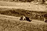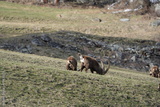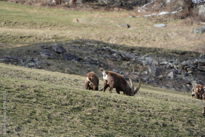 herd of steinbock capricorns grazing in Pontresina, Graubuenden, during summer. Ibex herd.
