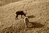 herd of steinbock capricorns grazing in Pontresina, Graubuenden, during summer. Ibex herd.