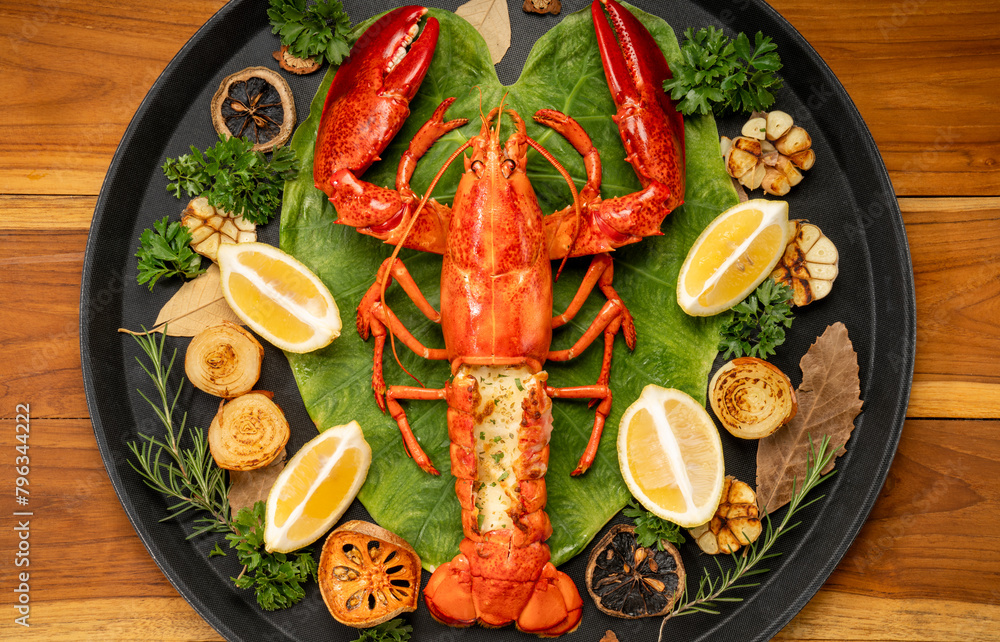 Grilled Lobster with Cheese in black wood plate, Grilled Canadian Lobster on wooden background.