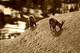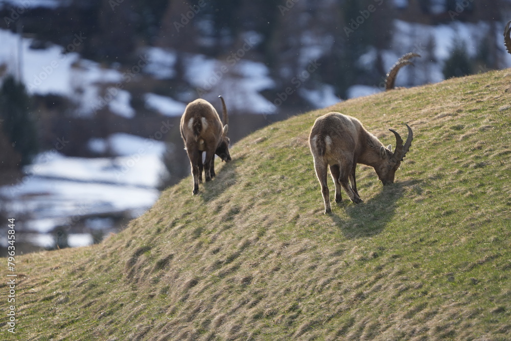 herd of steinbock capricorns grazing in Pontresina, Graubuenden, during summer. Ibex herd.