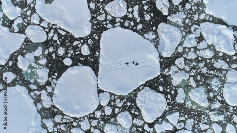 Gentoo Penguin Group Antarctica Ice Aerial View. Polar Wildlife Adult Bird Rest on Snow Surface. Harsh Antarctic Climate Environment Global Warming Concept Top Down Drone