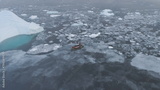 Zodiac Boat Sail at Iceberg Tracking Aerial View. Expedition Rubber Transport Explore Extreme Winter Cold Antarctic Global Warming. South Pole Seascape Drone
