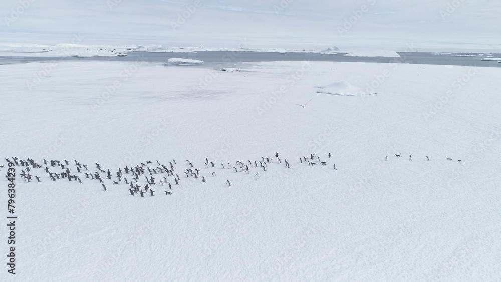 Gentoo Penguin Colony Migration Arctic Aerial View. Wildlife Bird Group Moving Antarctica Frozen Snow Covered Land. Polar Winter Extreme Scenery Drone Flight